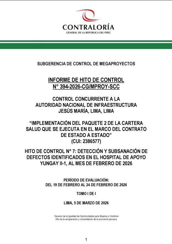 Según el Informe de Hito de Control Concurrente n.° 394-2026-CG/MPROY-SCC, cuyo periodo de evaluación comprende del 19 al 24 de febrero del 2026, la etapa de subsanación de defectos del Hospital de Apoyo de Yungay inició el 26 de enero de 2025 y finalizó el 25 de enero de 2026, con la emisión del certificado correspondiente.