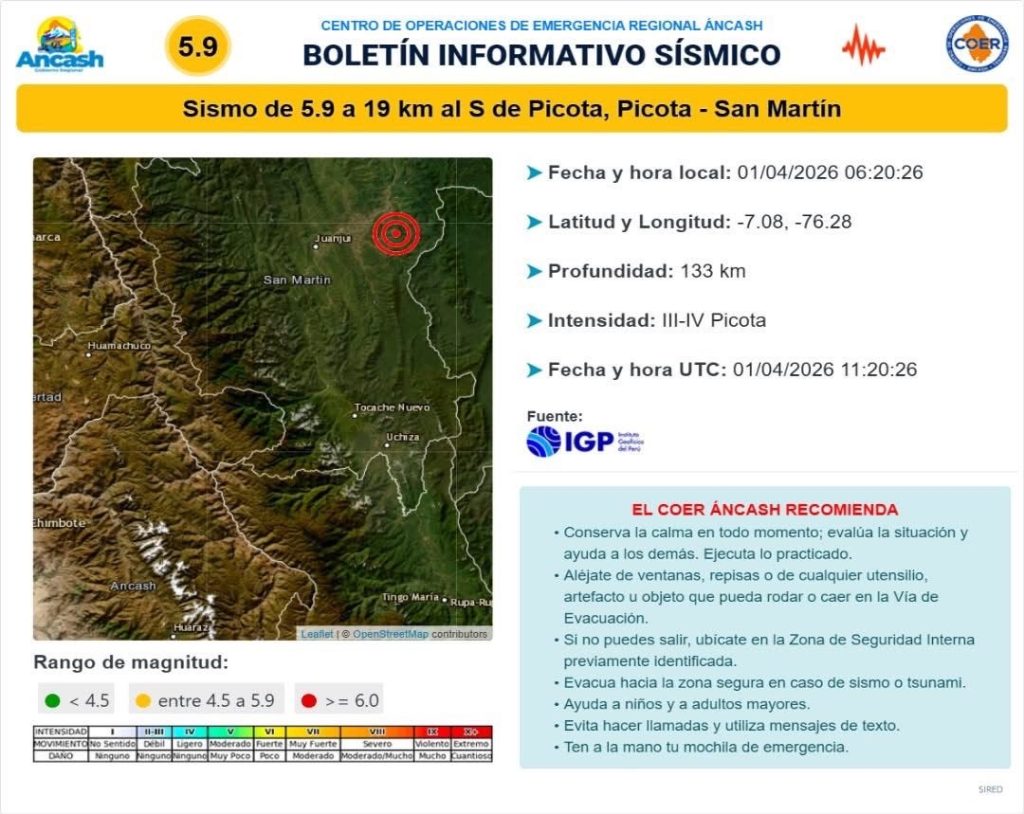 Un sismo de magnitud 5.9 remeció la región de San Martín la madrugada de este 1 de abril de 2026, generando alarma entre la población.