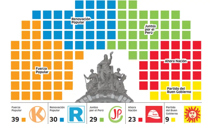 La realidad se conocerá a partir del 12 de abril próximo, pero a modo ilustrativo, la simulación arrojaba que Fuerza Popular podría tener la primera mayoría con 39 escaños, seguida por Renovación Popular con 30 curules y Juntos por el Perú con 29 representantes. Completan este bloque, el partido Ahora Nación, que alcanzaría 23 escaños, y el Partido del Buen Gobierno, con una proyección de 9 parlamentarios.