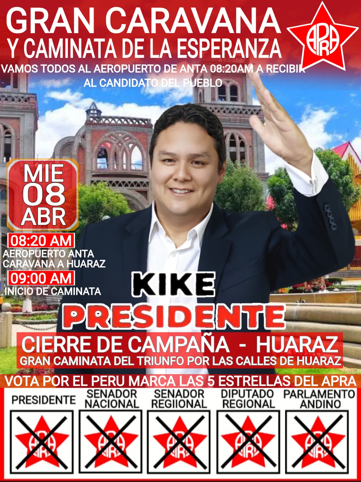 Ese mismo día, Carlos Álvarez, de País Para Todos, se reunirá con sus militantes en San Juan de LuriganchoAlfonso López Chau, de Ahora Nación, también convocará a sus simpatizantes en el Cercado de Lima al cierre de campaña en laplaz dos de mayo en la capital de la republica