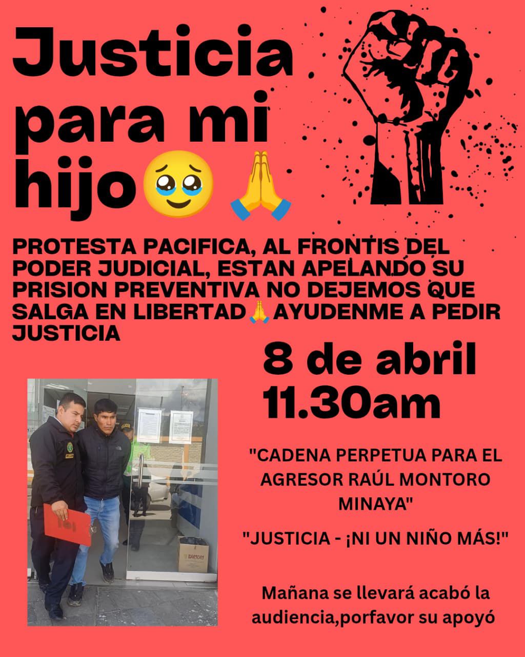 Esta mañana de Hoy Miercoles 8 de abril: audiencia de apelación de prisión preventiva para el violador de niños Víctor Raúl Montoro Minaya. ¡Ni un agresor más en las calles! ¡No más impunidad! ¡Los niños no se tocan!