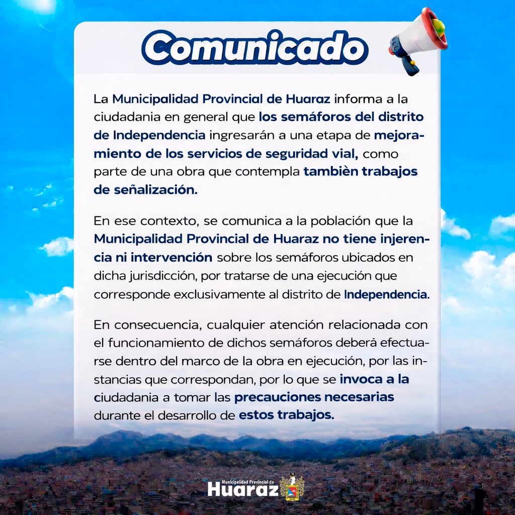 Para la Gestion del Alcalde Lalo Villa el tema del Transito en Independencia, era una responsabilidad de la Municipalidad de Huaraz, por ello dejo pasar mas de tres años, para poder calibrar algunos semaforos, pero descuidando su rol de Autoridad, por ello varios semaforos estan malogrados en el casco urbano del Distrito de Independencia. Queda claro la Responsabilidad del Alcalde Distrital y ahora candidato de Alianza para el Progreso a la Municipalidad de Huaraz. El saliente Alcalde de Huaraz David Rosales emitio un comunicado señalando toda la responsabilidad dela actual gestion de Lalo Villa en cuanto a los Semaforos.